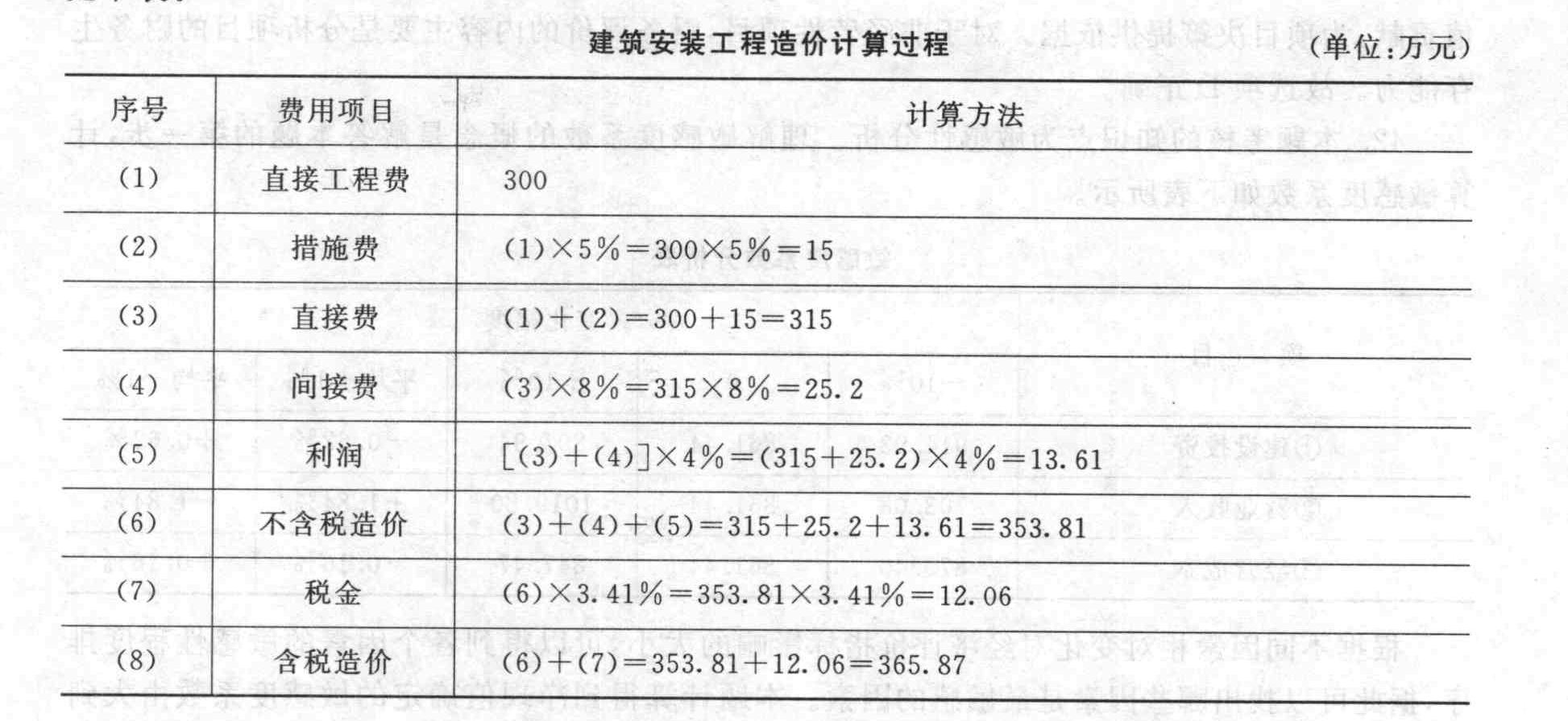 本題考核的知識(shí)點(diǎn)為建筑安裝工程造價(jià)計(jì)算。本題中建筑安裝工程造價(jià)的計(jì)算過(guò)程見(jiàn)下表。