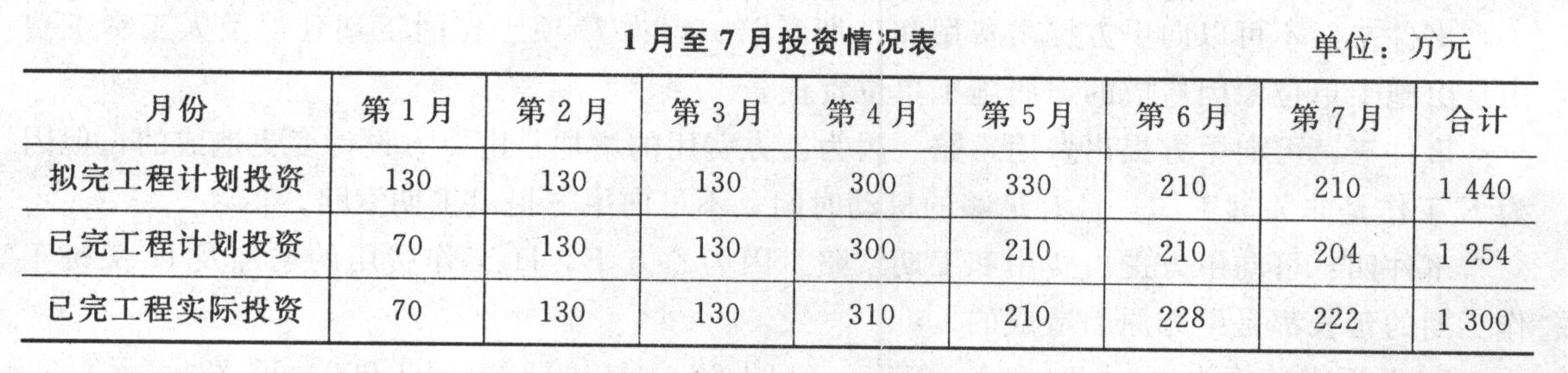 7月末投資偏差=1 300-1 254=46(萬元)>0,投資超支。7月末進(jìn)度偏差=1 440-1 254=186(萬元)>0,進(jìn)度拖延。