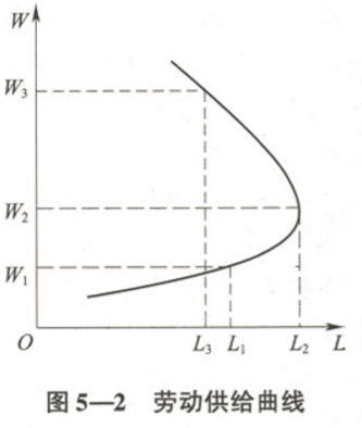時,消費者相對比較富有,工資增加的替代效應(yīng)小于收入效應(yīng),勞動供給減少,勞動供給曲線向后彎曲。